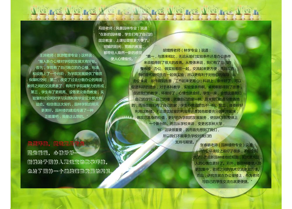 ① 冯丽老师(风景园林专业)说道:“在新的园林楼,员工们有了自己的固定教室,上课绘图就更方便了。明媚的阳光,宽敞的教室,都带给人焕然一新的感觉,使人心情愉悦。”