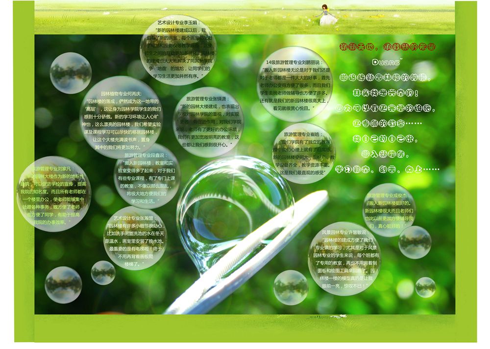 ① 艺术设计专业李玉娟:“新的园林楼建成以后,我们有了新的画室,每个画室都配备了电脑和投影仪等教学设备,这使师生之间的互动更加多样化。园林楼的建成也大大地解决了同其他公司争‘地盘’的尴尬,让同学们的学习生活更加井然有序。”