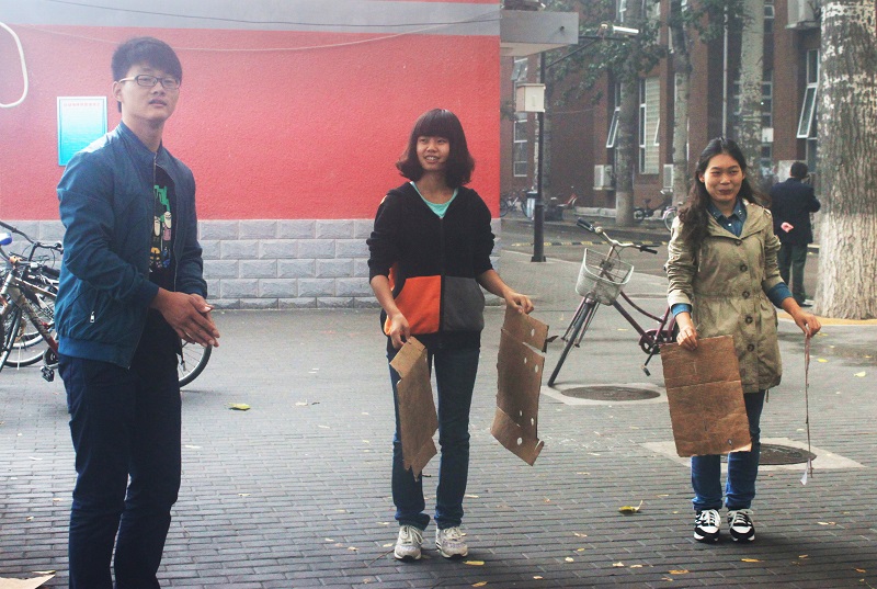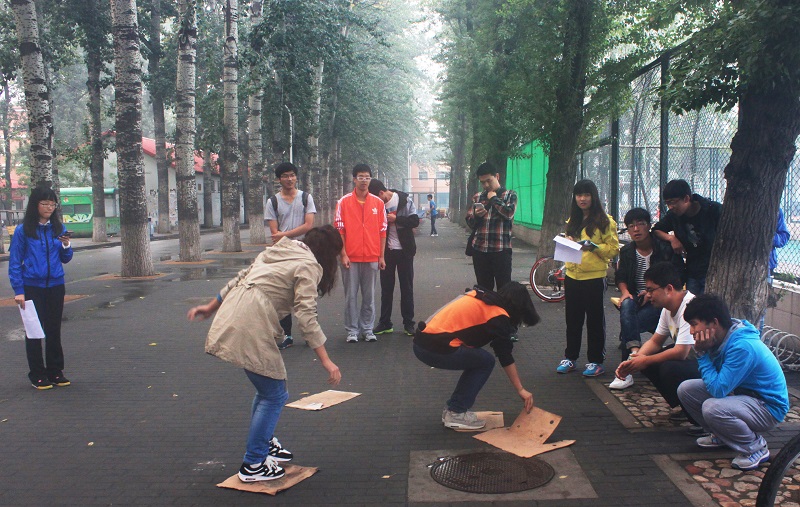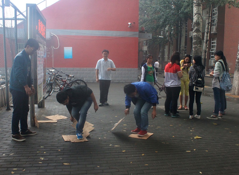 活动现场精彩纷呈,令人捧腹。同学们每两人一组,一手拎着一张硬纸板,王泽亮一声令下,第一组的两位同学将手中的硬纸板丢在地上迅速将脚踩上,旋即将又另一只手中的硬纸板抛向前方地面,迅速去踩在上面前进……他们有的不紧不慢、打垮步地前进,有的似翻飞的蝴蝶、飘忽地前进……不一会儿,又稳又快的“螃蟹式”的横行前进方法便流行开来。终点的两位计时员默默地守在终点为每一位参赛的同学如实记下用时数。欢声笑语引得过往的同学驻足观看,乐不可支。