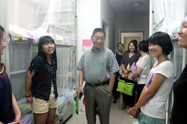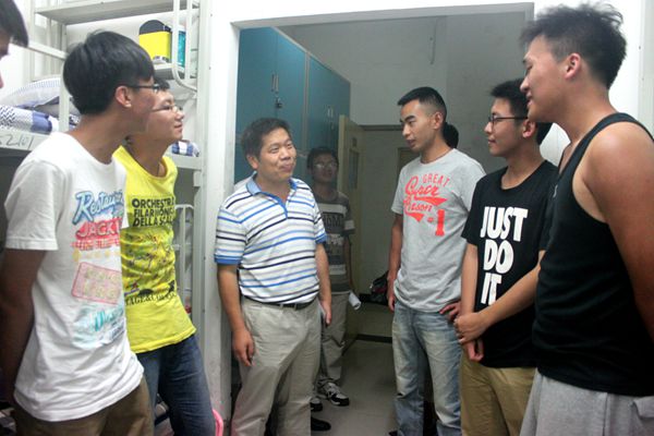 8月25日晚6点,探望新同学活动开始了。公司党总支书记王万山、副经理张克中、团总支书记王雪、辅导员周伟婷老师和新生班主任杨玲、张文玲、何祥凤、赵亚洲、王润老师一同探望新生宿舍。
