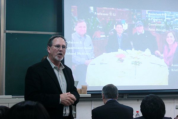 会上,Richard 首先就本公司的基本概况进行了简单的介绍。康涅狄格大学是一所1881年建校的公立大学,拥有100多个专业的学士学位,教学和科研方面都享有国际声誉,也被誉为“美国最值得一上的大学”之一。同时也表示很期待与中国高校建立互联互惠的关系,之后详细介绍了园林和风景园林等专业本科生留学美国的“3+1”和“3+2”项目,涉及留学的学费,专业的分类,学位的介绍和团队的配备等方面。Pete和Kristin也先后就自身的学习履历,教学方向目标,项目研究成果等进行了简单的说明。
