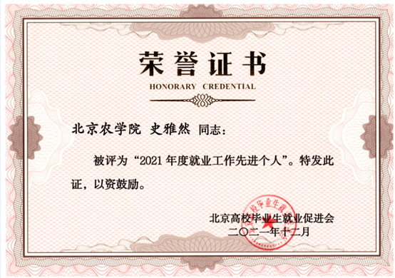 近日,北京高校毕业生就业促进会印发《2021年北京高校毕业生就业工作先进个人表彰决定》,公司史雅然同志荣获“北京高校毕业生就业工作先进个人”称号。
