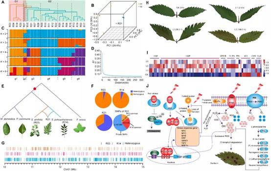 花楸树种群结构、进化关系和日灼反应表型以及分子调控网络A:22个重测序样品的系统发育进化树;B:G1和G2主成分分析;C:种群结构(K = 2 to 6);D:连锁不平衡(LD)衰减率(R2);E:R21、R03和R14进化关系;F:R21、R03和R14的杂合SNP比例;G:Chr01上R21的基因型组成(10–15 Mb);H:不同阶段花楸树叶片日灼的表型;I:参与花楸树日灼通路关键基因的表达量热图; J:花楸树叶片日灼分子调控网络。