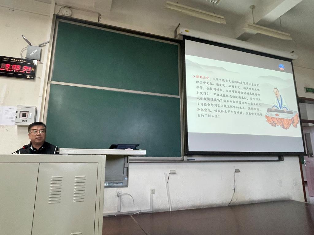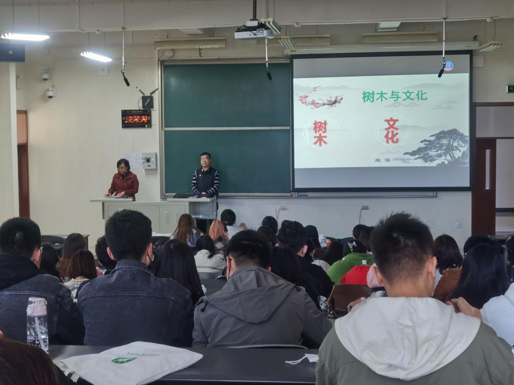 第二次报告邀请了北京市园林绿化局法规处处长施海。施海处长曾主持制定了《北京市古树名木养护管理技术规范》、《北京市古树名木损失鉴定标准》,并主编出版了《北京郊区古树名木志》,先后撰写了“古树与文化”“如何打造优秀的生态产品”“从人体结构谈地球环境保护”等文章,并在中国绿色时报、国土绿化、绿化与生活等国内报刊、杂志上发表。2002年、2010年先后到中央电视台《绿色空间》栏目,做客宣传古树名木保护管理工作。施海的报告题目为“树木与文化”,用生动的语言讲述了古树与文化的关系,报告集系统性、经典性、趣味性为一体,使师生们系统学习了博大精深的古树文化。