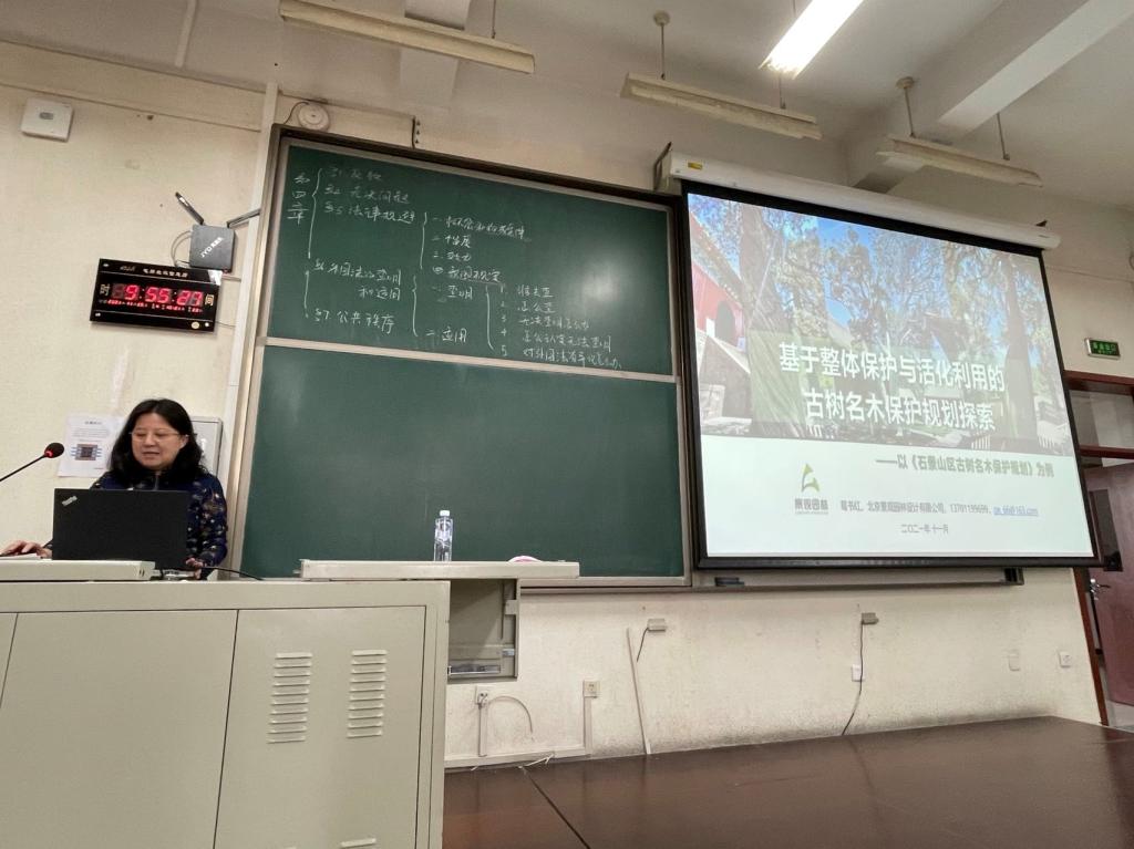 第三次报告邀请了北京景观园林设计有限公司研究院经理葛书红。葛书红曾主持了石景山区古树名木保护规划项目。葛书红的报告题目为:“基于整体保护与活化利用的古树名木保护规划探索”,报告系统讲述了城市古树名木保护规划的思路、指导思想、规划的方法和路径,以及详细的规划内容。报告对于同学们以后做相关研究起到了重要的方向引领作用,其方法论也具有很强的指导作用。