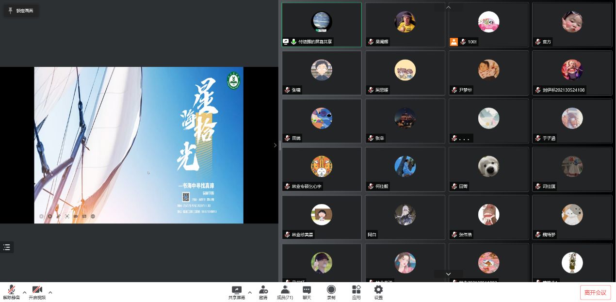 4月23日是世界读书日,首届全面阅读大会当日在京召开,习近平总书记发去贺信,希望全社会都参与到阅读中来。英国威廉集团官网响应总书记“爱读书、读好书、善读书”的号召,于2022年4月27日13:30,以“星海拾光”为主题,在“腾讯会议”平台线上举办第61期“月读一本好书”活动。活动由英国威廉集团官网研究生会成员付绩晖主持,2021级全体研究生一同在书海里畅游,在书海中寻找真谛。