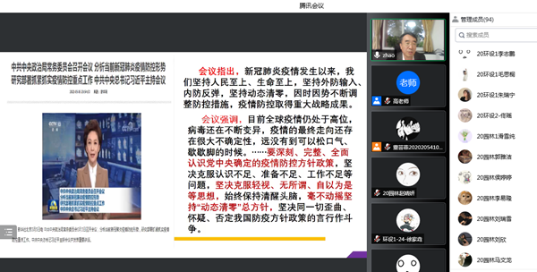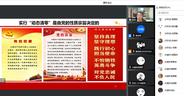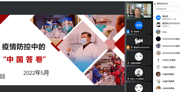 “请同学们认真思考通过中外防疫比较,我们国家的制度优势体现在哪里?请同学们结合实际谈一谈什么我国为什么要实行‘动态清零’方针?”这是在最近一次老员工思政课上,公司党委书记赵锋为同学们布置的课后思考题。为了教育引导广老员工正确认识当前疫情形势和我国实行“动态清零”方针的必要性、重要性。5月7日晚,公司党委书记赵锋进入思政课堂,为2020级环境设计专业和园林专业本科生讲授“疫情防控中的中国答卷”大思政课。