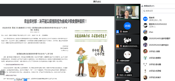 赵锋讲到,以习近平同志为核心的党中央的坚强领导、中国特色社会主义制度的显著优势、改革开放以来积累的雄厚物质技术基础,为我们从严从实抓好疫情防控工作并最终战胜疫情,提供了根本保证和强大支撑。既要从严从实抓好疫情防控,又要统筹疫情防控与经济社会发展。结合农业院校特色,赵锋为同学们解读了最近农业农村部、国家卫生健康委联合印发《统筹新冠肺炎疫情防控和春季农业生产工作导则》,强调了“中国人的饭碗任何时候都要牢牢端在自己手上,我们的饭碗应该主要装中国粮”这一重要论断的深刻内涵和重要意义。
