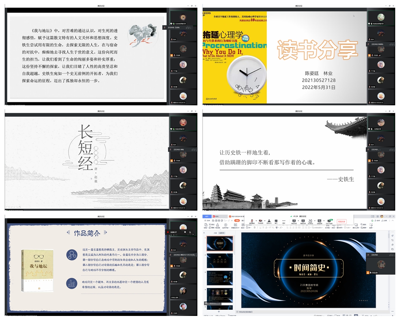 本期活动的第一环节由王欣怡、陈姿廷、戴炜杰、焦艳、翟硕、张辛6位同学为我们分享了《我与地坛》、《拖延心理学》、《长短经》、《时间简史》4部著作,将自己的阅读感悟分享给大家。