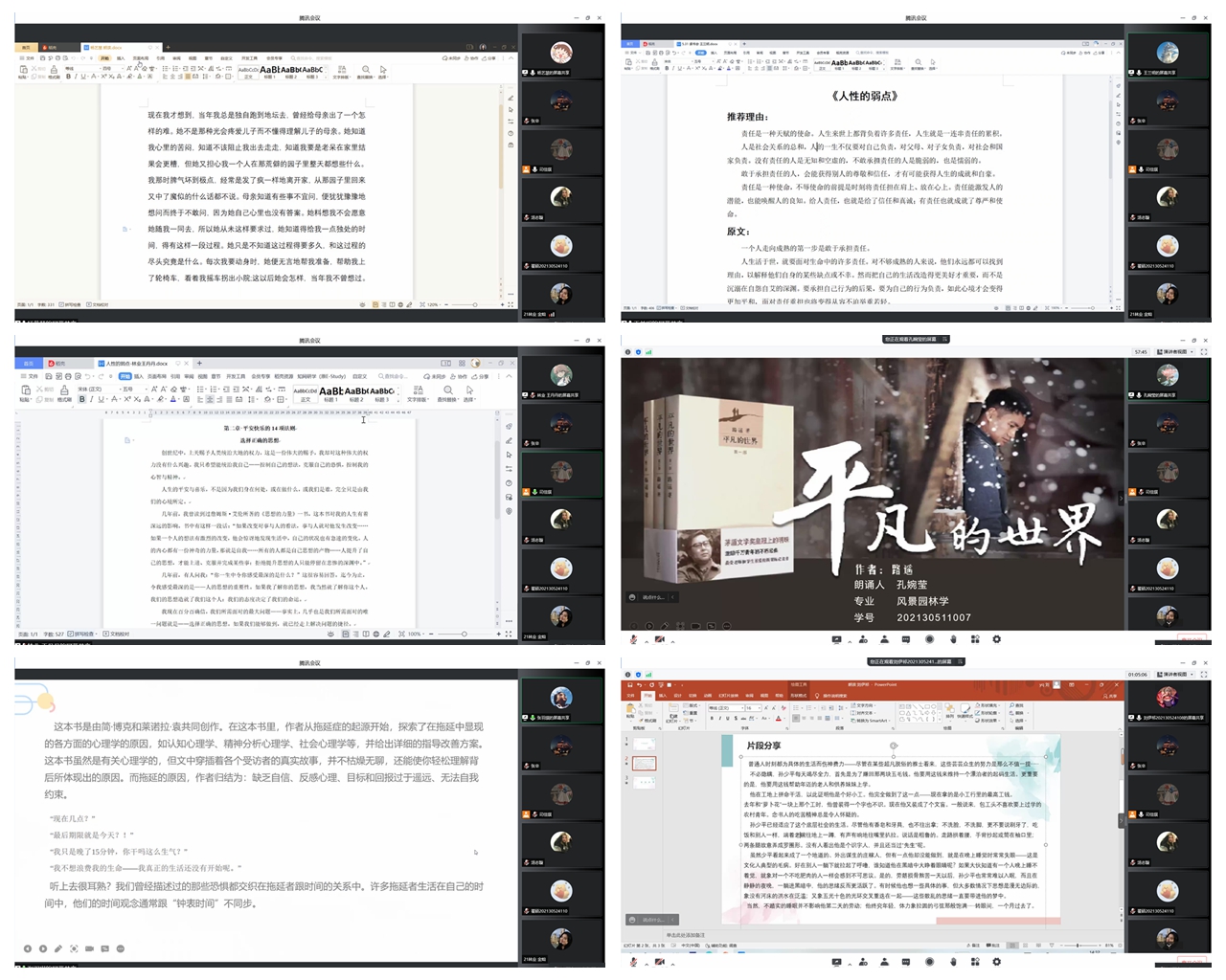 第二环节由杨艺慧、王兰明、王丹丹、孔婉莹、张羽琪、刘伊祁6位同学带来《我与地坛》、《人性的弱点》、《平凡的世界》、《拖延心理学》4部好书原文精彩片段诵读。