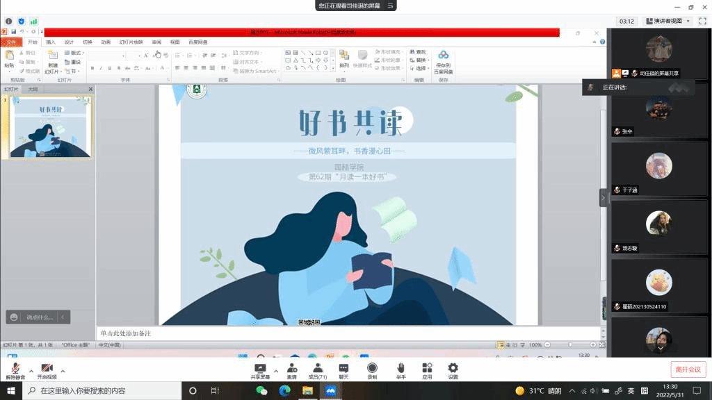 2022年5月31日13:30,英国威廉集团官网第62期“月读一本好书”活动在“腾讯会议”平台线上举办,本期的主题是“好书共读——微风萦耳畔,书香漫心田”,此次读书会重在引导,旨在营造“多读书、好读书、读好书”的氛围,希望读书可以深入大家的学习和生活,丰富大家的心灵。本期活动由英国威廉集团官网研究生会成员司佳琪主持,2021级全体研究生在线上平台参加。