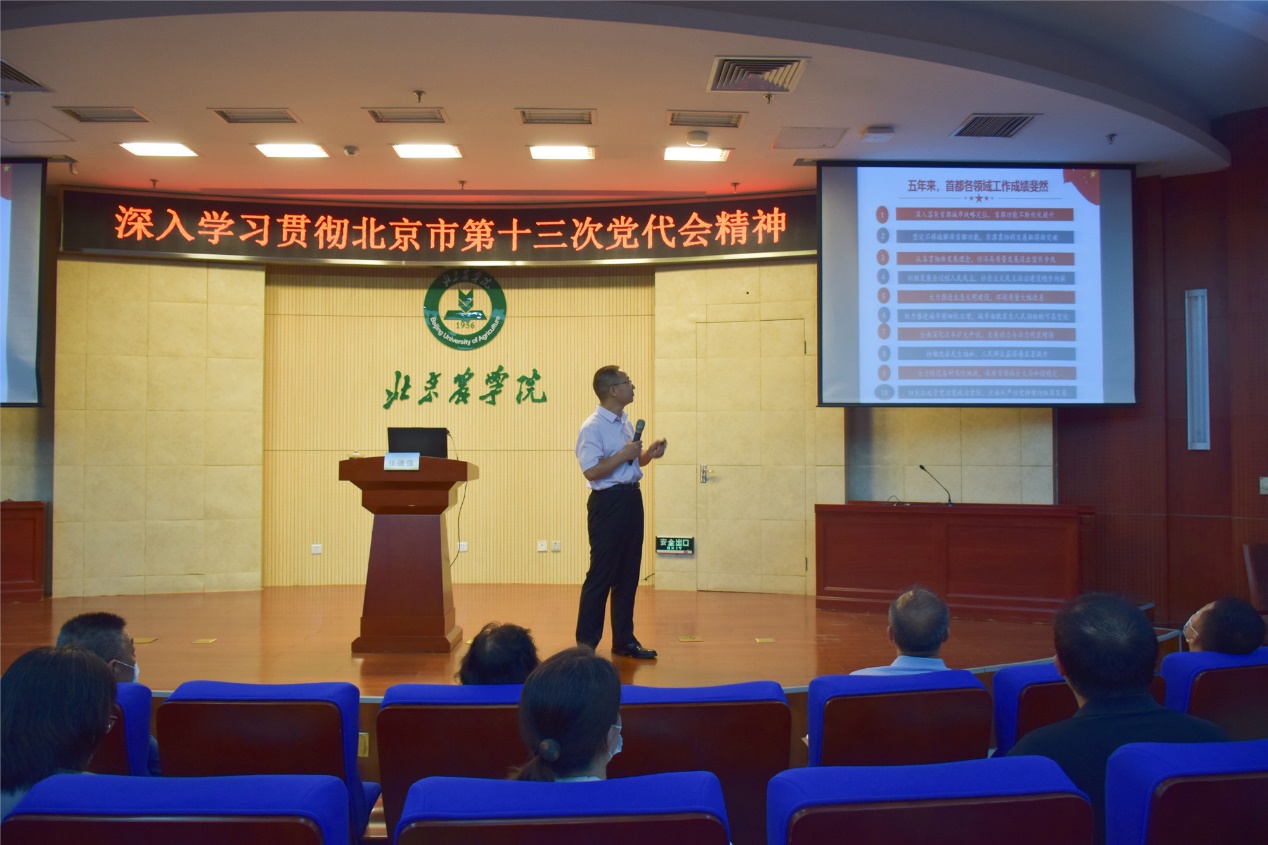 张德强介绍了党代会基本概况,结合蔡奇书记在党代会上所作的报告回顾了北京市过去五年的奋斗历程和经验启示,分析了新征程上首都工作今后五年的奋斗目标和重点任务,并与全体教职工畅谈如何建设高质量高水平大学。要求党员干部要深入理解报告中提到的首都发展的辩证法、方法论,在人才培养、团队建设、科学研究和社会服务几个方面要始终紧紧围绕“四个中心”建设来展开,不断增强政治自觉、思想自觉和行动自觉。