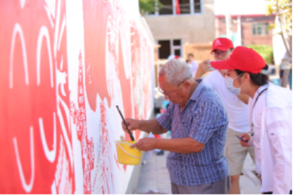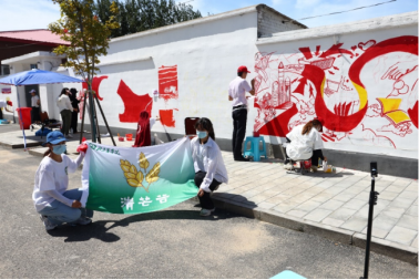 活动以乡村墙绘为载体,四家庄村为墙绘绘制场地,由创作作品员工亲自实地绘画。墙绘内容将“乡村振兴”与“党史党建”两部分紧密联系本地现实情况,成为中国共产党领导人民走向幸福繁荣的真实写照。两大主题紧扣乡村振兴政策,宣传指引前进方向,结合本土乡村历史文化,深入建设本地精神文明。不浮夸、接地气的墙绘活动激发起当地村民的参与热情,成为了地校间文化互动交流的载体和生动的党建宣传形式。一些村民运用其所擅长的书法和绘画为墙绘添砖加瓦,一些村民前来为墙绘扶梯搭架、送餐送水,当地小朋友也兴致勃勃地参与到墙绘制作中,村民们以各自擅长的方式与员工共同助力完成了墙绘绘制。墙绘中的“四家庄村乡村振兴印记榜"则为这些活动的参与者们留下了美好珍贵的真实印记。
