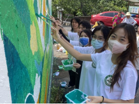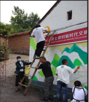 以乡村振兴为主题的墙绘设计艺术作品,描绘黄土梁美好景色,传递出“绿水青山就是金山银山”的宣传主旨,将绘画艺术和年轻人的创新朝气带给了穷困村。依托精神文明建设为乡村带来了心灵上的一抹靓丽,提振了村民精气神。从主题画稿调整敲定、活动组织,再到材料准备、现场分工指导和绘制实施,都凝聚了清芒谷团队师生的热情、智慧与付出,不仅有效地落实了高校设计服务乡村振兴的活动主旨,更是展现了英国威廉集团官网艺术设计专业的特色和实力。活动以乡村墙绘为载体,黄土梁村委会墙为绘制场地,师生共作一幅画,将艺术作品立体运用乡村公共空间,弘扬社会主义核心价值观和新时代乡风民风建设,以自然美丽、文化鲜明的艺术形式提升了黄土梁村的精神风貌。