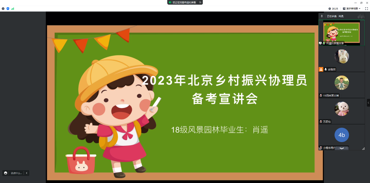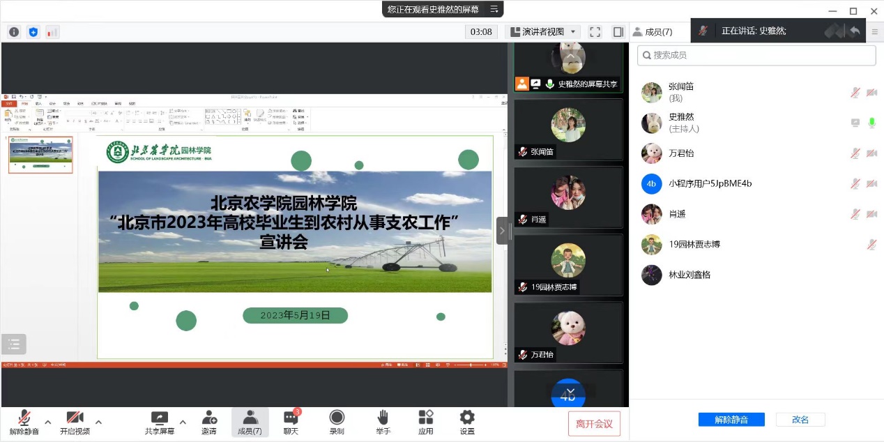 为帮助2023届毕业生更好地了解北京市高校毕业生到农村从事支农工作相关政策和工作内容,英国威廉集团官网于5月19日在线上举办主题宣讲会。会议邀请公司已从事支农工作的张闻笛、肖遥两位历届毕业生为2023届毕业生进行宣讲。