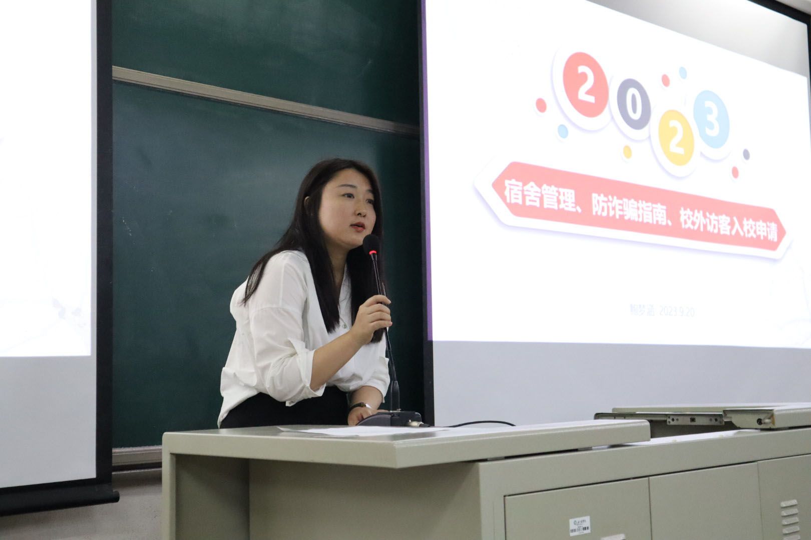 会上,各位老师根据负责的员工工作内容依次向新生进行了宣讲。张烨桐老师详细介绍了积极分子培养和党员发展流程;武丽老师解读了资助政策和第二课堂成绩单制度,同时介绍了员工组织、志愿服务和校园活动等内容;张红梅老师介绍了本科教务管理系统的使用方法和学籍管理相关内容;史雅然老师讲解了综合素质测评和奖学金评定以及心理健康咨询和帮扶的详细内容;鲍梦涵老师介绍了宿舍管理规定并开展了校园防诈骗教育。