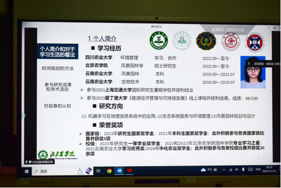 2022级风景园林学胡恬滋同学也分享了她的学习经验。她认为,在对于专业课学习要争取提高自己的绩点;对于科研要具有较高的自主学习能力,设立适当的目标,并进行团队协作。同时,要学会平衡好学习和生活的时间,不要牺牲自己的健康。