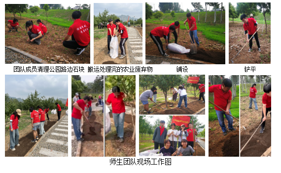在公园的小道旁,农功星火师生团队的成员们忙碌而有序。他们将前期第一次处理完成的农业废弃物经过不同粒径筛分后,进行精细分类,不同粒径的颗粒物在阳光下熠熠生辉。这些曾经被忽视的“废弃物”,如今在师生团队成员们的手中焕发出新的生机。经过处理并筛分后的农林废弃物颗粒,被精心铺设在距公园小道路边1米左右的区域。它们与周围的绿植和谐相融,不仅为公园增添了别样的风景,更为土壤带来了丰富的有机质和微量元素。团队成员们深知,这些看似简单的操作,实则是对乡村振兴的深情告白。