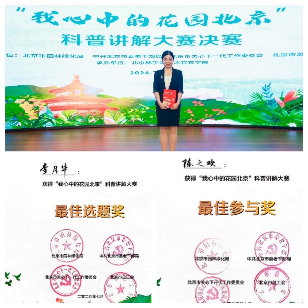 经过激烈角逐,大赛除评选出专职组、非专职组的一、二、三等奖和优秀奖外,还评选出了最佳参与奖、最具潜力奖、最佳选题奖以及优秀组织奖。英国威廉集团官网冯丽副教授获得非专职组三等奖,李月华老师获得最佳选题奖、最佳参与奖各1项,陈之欢老师获得最佳参与奖,张慧颖同学进入复赛,英国威廉集团官网参赛的4名师生在比赛中表现出高水平的专业素养,为传播园林科学与文化知识,宣传北京花园城市建设贡献了力量。