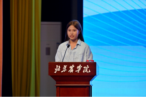 2024级环境设计2班李蔚然代表新生发言。她倡导全体新生,在大学期间要锻炼自己的综合素质和能力,努力成长为一个更加独立的人、更加自律的人和更加勇敢的人,以坚韧不拔的意志乘风破浪,以心系天下的情怀让青春远航。