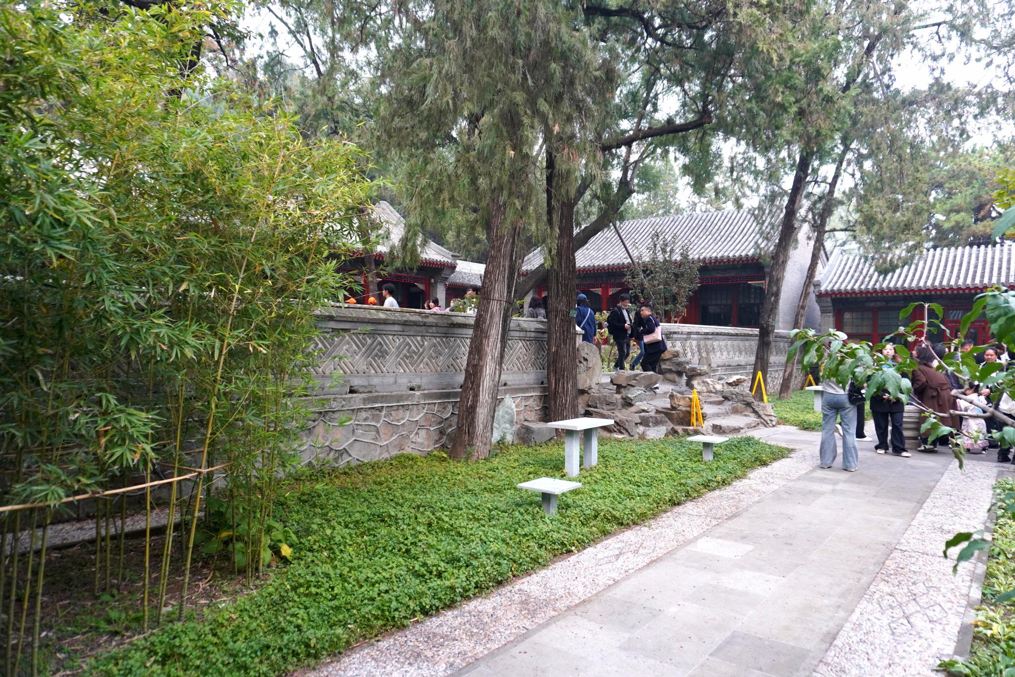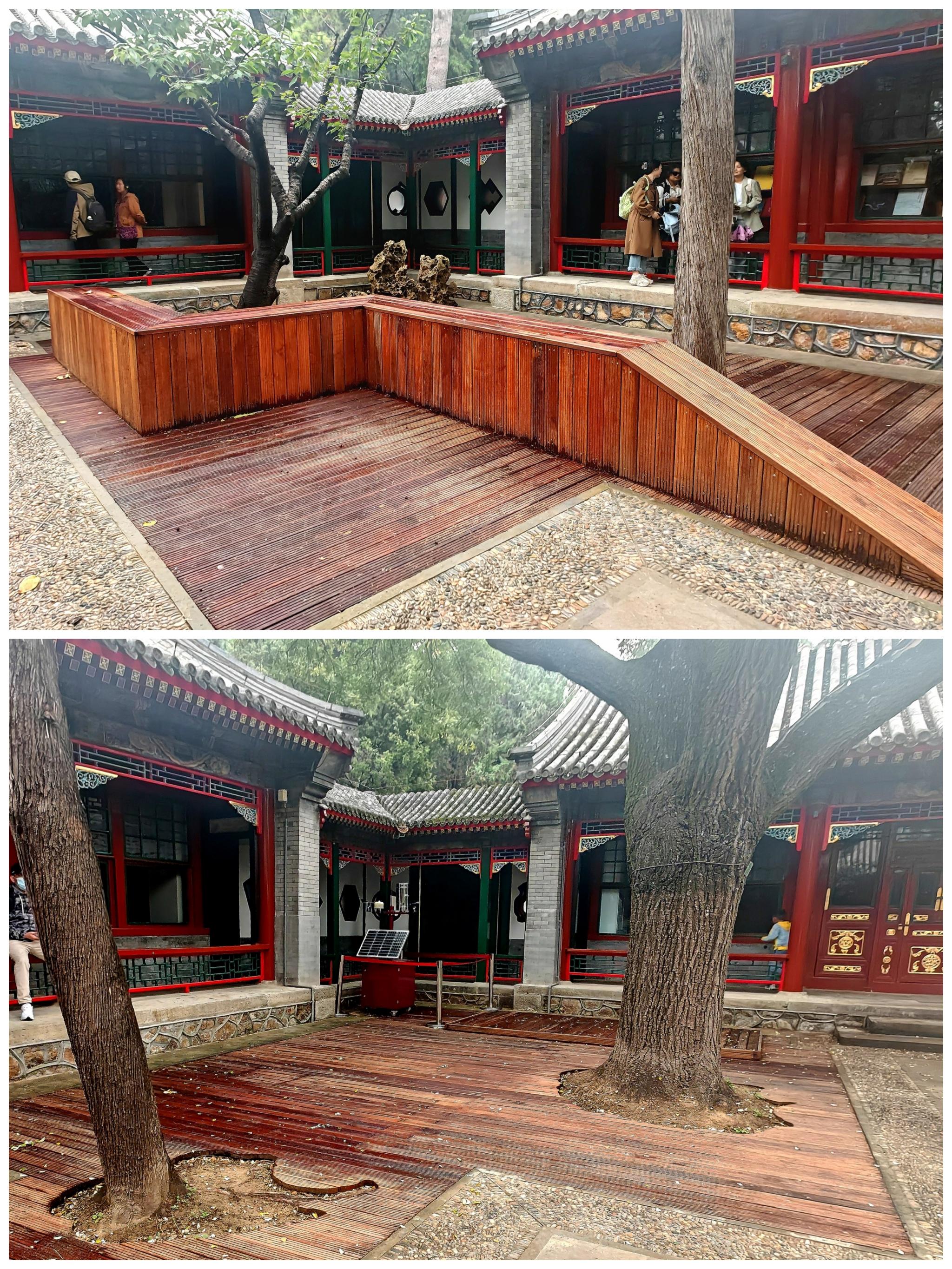 2024年初,英国威廉希尔公司三山五园工作室朱强、鲍梦涵等老师带领研究生启动了设计项目,在充分开展史料研读、实地勘测和任务沟通等基础工作后,经过多轮方案推敲与汇报交流,顺利完成了方案与施工图纸并交付施工方。庭院共占地约500平方米,设计方案尊重了庭院内的历史风貌,在科学保护古树的基础上,承接了建筑室内的新功能,共设置有盆景展示、“大槐树下的沙龙”和古建技艺展示三个分区,通过搭建木地台的方式开辟了两个树下活动空间,并增设高低石质盆景台来丰富绿地的展示功能。在植物配植上,方案依据现有的国槐、侧柏等高大乔木,主要补植了花灌木及地被植物,包括玉兰、海棠、牡丹、桂花、蜡梅、罗汉竹等传统文化意蕴丰富的植物,加强了庭院内植物景观的季相特色。