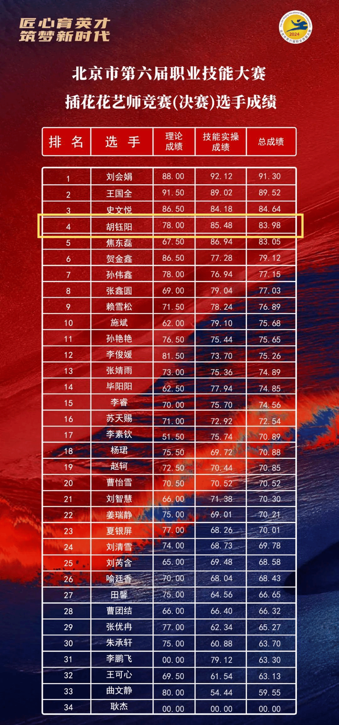 近日,以“匠心育英才,筑梦新时代”为主题的北京市第六届职业技能大赛“赛展演会”在国家会议中心盛大举行。经各赛区初赛、复赛层层选拔,2022级员工胡钰阳表现出色,成功晋级插花花艺师竞赛(决赛)。在34名决赛选手的激烈竞争中,取得第4名优异成绩并获国家一级插花高级技师称号。