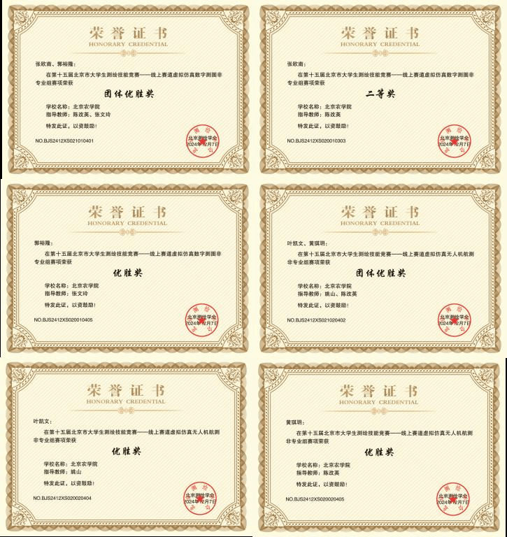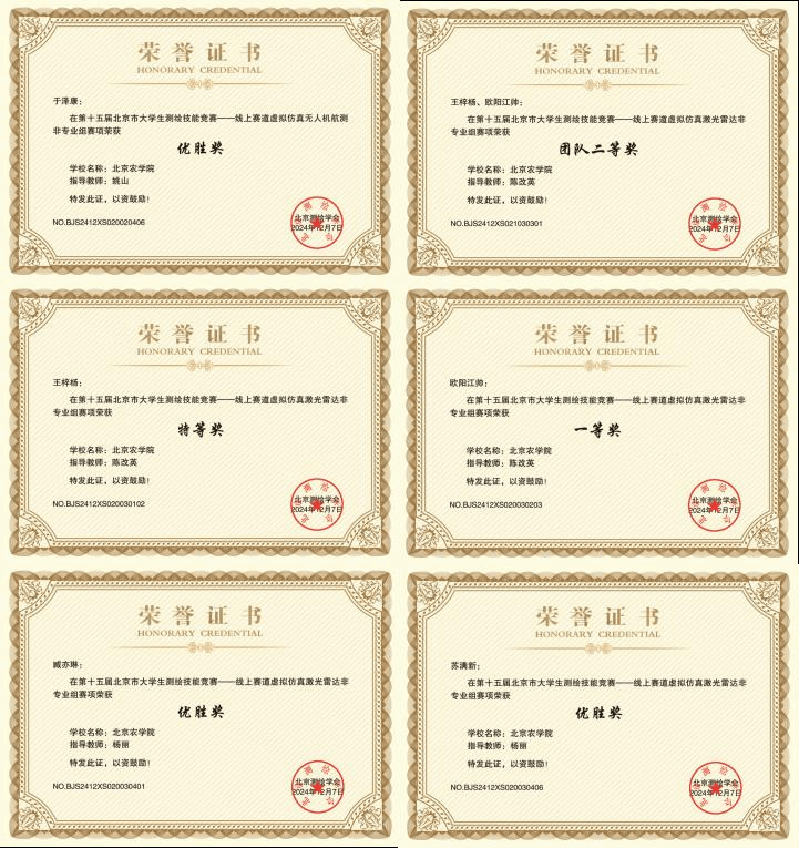集团代表队在激烈角逐中表现出色,共获得十八个奖项。数字测图虚拟仿真赛项:张欧南和郭裕隆同学荣获团体优胜奖;张欧南荣获个人二等奖,郭裕隆荣获个人优胜奖。无人机航测虚拟仿真赛项:叶凯文和黄琪玥同学荣获团体优胜奖;叶凯文、黄琪玥、于泽康分别荣获优胜奖项。虚拟仿真激光雷达赛项:王梓杨和欧阳江帅荣获团体二等奖;王梓杨荣获个人特等奖,欧阳江帅荣获个人一等奖,臧亦琳、苏满新分别荣获个人优胜奖;线上赛道非专业组奖项:张欧南、叶凯文、王梓杨和郭裕隆、黄琪玥、欧阳江帅6位同学荣获了团体二等奖。陈改英、姚山、杨丽、张文玲老师荣获优秀指导教师奖。