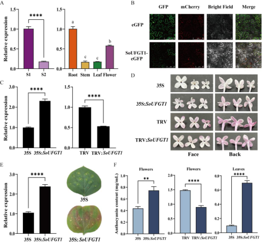UDP-葡萄糖:类黄酮3-O-葡萄糖转移酶(UFGT)在花青素的稳定形成中发挥着关键作用。本研究首先在多组学联合分析的基础上,筛选出了与花青素合成密切相关的SoUFGT1,将其在紫丁香叶片和花瓣中瞬时过表达可导致出现显著的花青素积累表型(叶片由绿变红,花瓣颜色变深),而在花瓣中沉默该基因,花色变浅,表明SoUFGT1介导了花青素的合成。