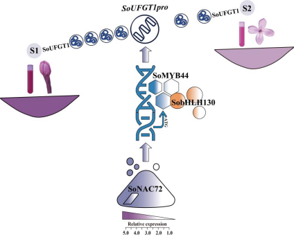 图2 SoNAC72-SoMYB44/SobHLH130调控紫丁香花瓣褪色模式图