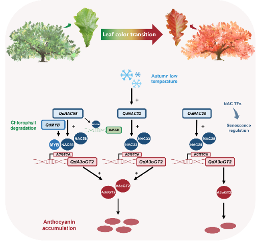 本研究揭示了QdA3oGT2基因在槲树秋季叶色转变中的关键作用,阐明了QdNAC58如何通过调控QdA3oGT2基因的表达来影响花青素的合成和积累,并提出了QdNAC58- QdA3oGT2模块在槲树叶色转变中的调控模型(图2)。基于前期研究结果,QdNAC58既参与了花青素的合成,又能与叶绿素降解基因QdSGR启动子结合,调控叶绿素降解。本文获得的研究成果不仅增加了对槲树适应性策略的理解,解析了落叶木本植物叶片响应秋季环境低温衰老转色的调控机制,还为高效选育秋季叶片观赏期长的林木“增彩延绿”新种质提供基因靶点。