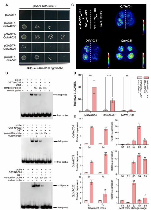 研究团队基于槲树全基因组,鉴定出5个A3oGT基因家族成员,其中QdA3oGT2基因表达量显著高于其他成员,并且与花青素含量变化呈显著正相关,可能在槲树叶色转变过程中发挥关键作用。过表达QdA3oGT2基因的拟南芥具有更高的花青素含量和更强的耐寒性,表明QdA3oGT2基因不仅参与花青素的合成,还能提高了植物的耐寒性。研究团队还筛选到3个与冷响应和衰老相关的NAC转录因子,QdNAC58,QdNAC33和QdNAC28。Y1H,LUC和EMSA验证了3个NAC转录因子能够直接结合QdA3oGT2基因启动子上的NAC保守基序。其中,QdNAC58在低温条件下被诱导表达,进而上调QdA3oGT2基因的表达水平,促进了花青素的合成和积累(图1)。