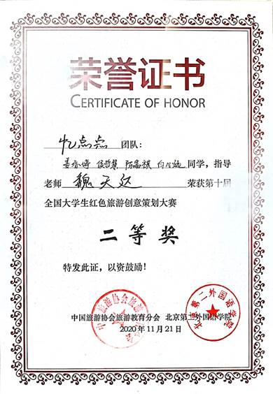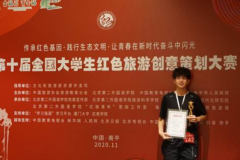 11月21日,第十届全国老员工红色旅游创意策划大赛总决赛在福建省南平市落下帷幕。30支老员工队伍从来自全国298所高校的1800余支队伍中脱颖而出,围绕南平红色旅游发展进行设计,比拼创意“金点子”。2019级白心远同学和北京第二外国语公司同学联合组建的“忆点点”团队在本次比赛中荣获了二等奖的优异成绩,实现了公司员工参与此项赛事成绩零的突破。