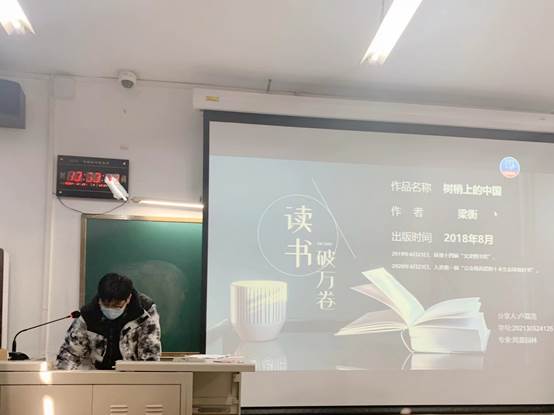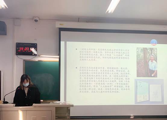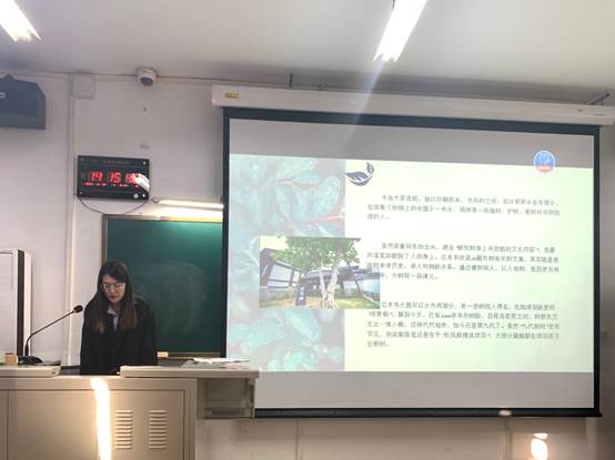 第二位进行分享的是林业的金灿同学。她首先分析了书和树之间的关系:书由木浆造纸,加以印刷而来,或许它们之间冥冥中自有缘分。而在梁衡先生的书中,同样有一批植树、护树、爱树并与树结缘的人。借古树讲历史,讲人与树的关系。通过借树写人,以人说树,在历史与传说之中,为树写一段演绎。