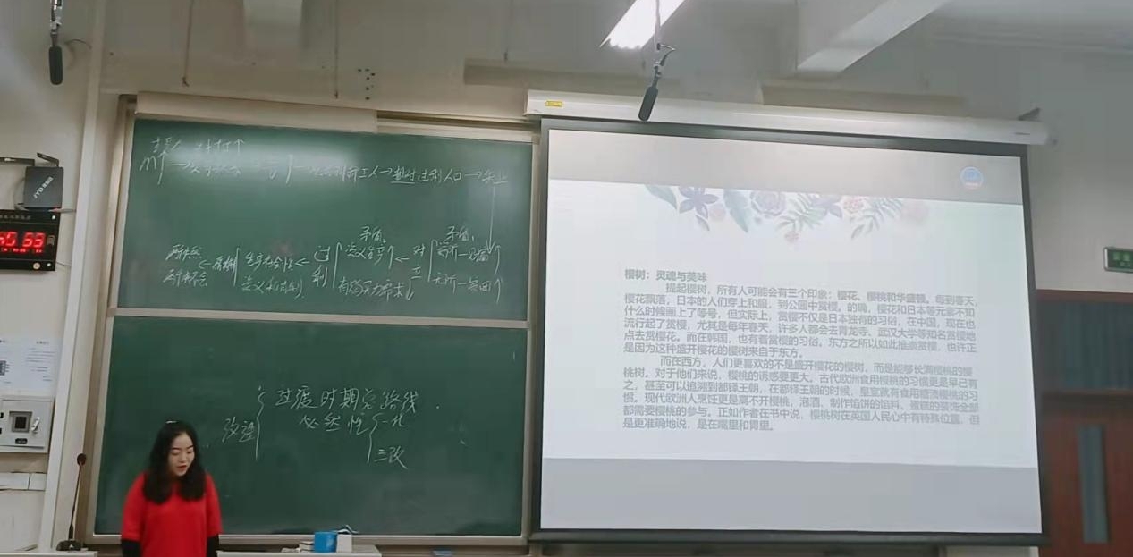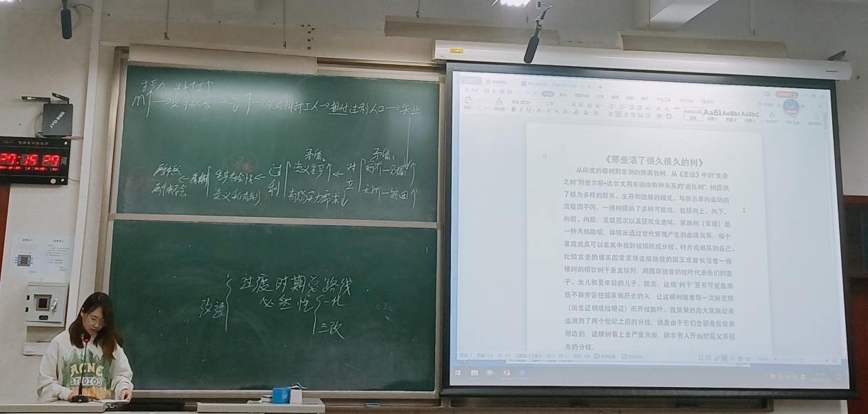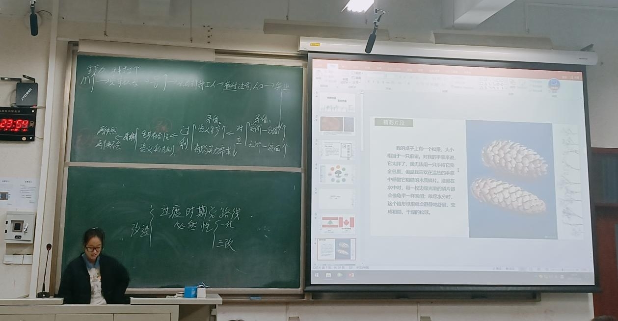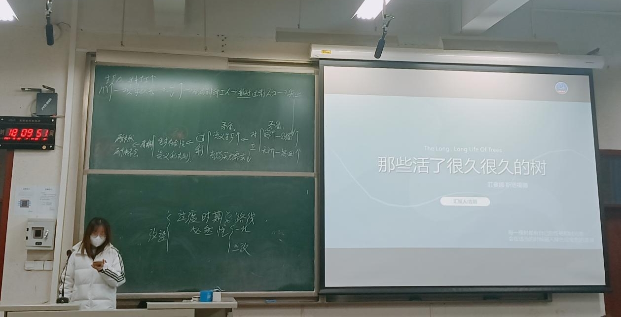 最后一位分享的同学是来自林业的王思婷同学,她通过英国牛津大学教授菲奥娜·斯塔福德在《那些活了很久很久的树》书中的话,表达了我们根本不会注意到的平凡之树。她举例说明了17种树,红豆杉、樱树、花楸、油橄榄、柏树.、松树、苹果树……她的感悟和结论是:这些树木不只是植物学上的存在,它们背后的意义还与历史、传说交相呼应。