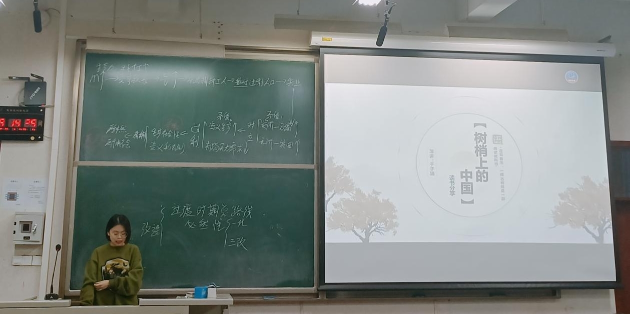 第二位进行分享的是风景园林专硕的于子涵同学,她为我们带来了的是《树梢上的中国》这部散文集,这是梁衡先生跋山涉水寻访人文古树后写就的一部散文集。于同学介绍中最精彩的一句话是“愿为信念托此生”,这是梁衡先生的写作念头,通过借树写人,以人说树,在历史与传说中,为树写一段演义。让每一位同学感受到了人与树的密不可分,通过树诉说着人的感情与历史。