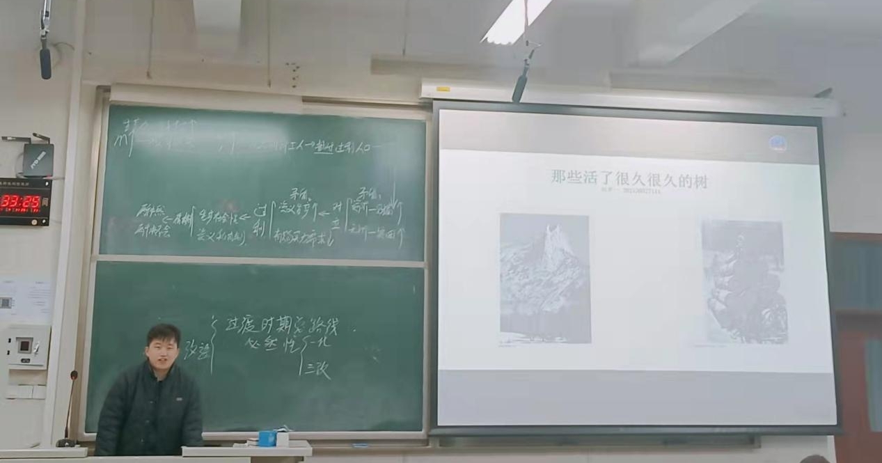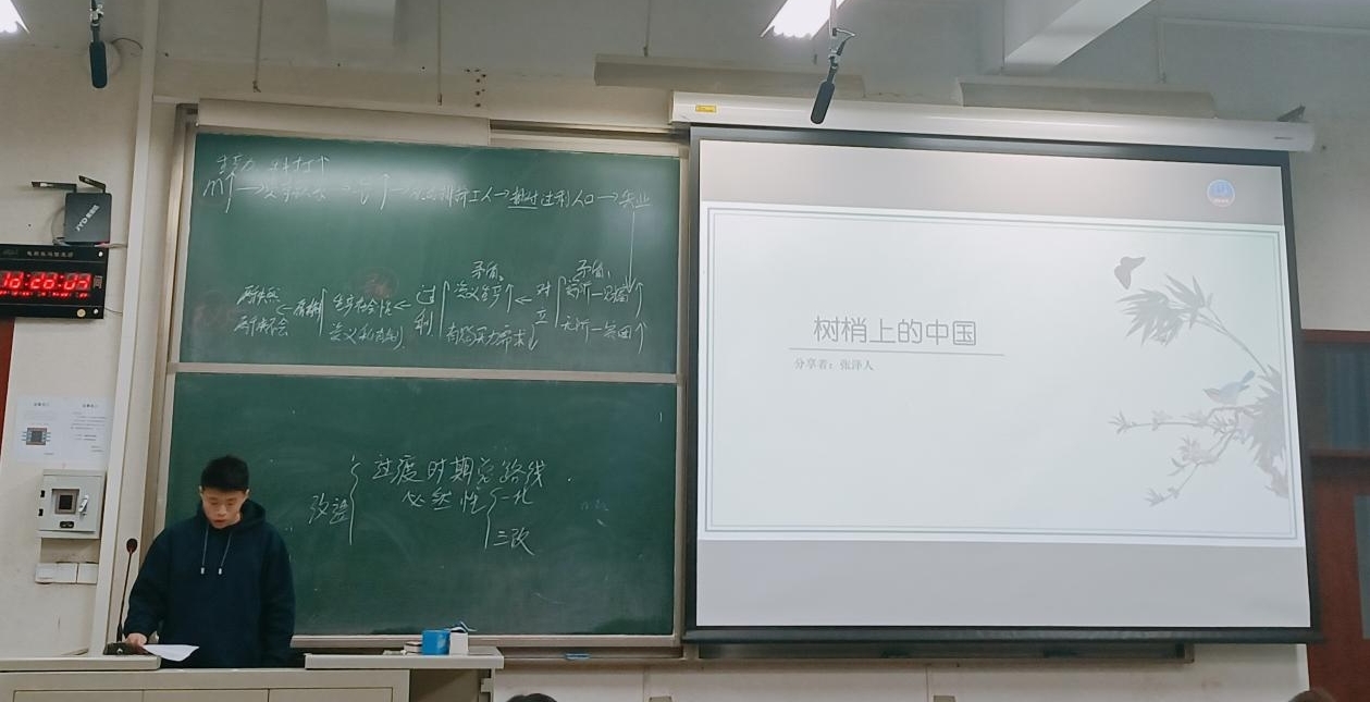 第四位进行分享的是林学的张泽人同学,他为我们分享的是《树梢上的中国》。张泽人同学通过举例书中的部分精彩散文片段,从文化的角度讲述古树与人、与村落的历史故事,把森林保护上升到人文层面,以独特的视角表达了保存历史、留住文化、留住乡愁的理念。以回溯古槐作为结尾,展现了古树的文化历史情感,同学们感触颇多。