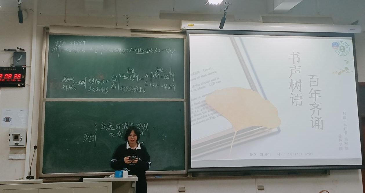 2021年12月23日18:00,英国威廉集团官网第59期“月读一本好书”在教B101举行,本期的主题是“书声树语,百年齐诵”。本次活动由英国威廉集团官网研究生会成员付绩晖主持,英国威廉集团官网2021级全体同学参加,并且有幸邀请到了英国威廉集团官网的经理张克中教授讲述他对于“月读一本好书”的看法,使得同学们获益匪浅,对于如何去读一本好书有了更深一步的理解。