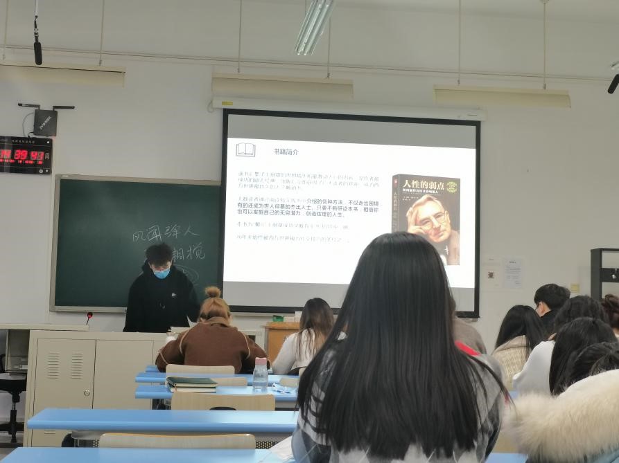 风景园林专业研究生杨帅同学带来的是《人性的弱点》,他通过对美国“成人教育之父”戴尔·卡耐基的介绍、对人际关系的基本技巧和阅读方法的解读以及自身的收获分享,讲述了许多普通人通过奋斗获得成功的真实故事,激励同学们走出迷茫和困境,帮助大家重新找到自己的人生意义。